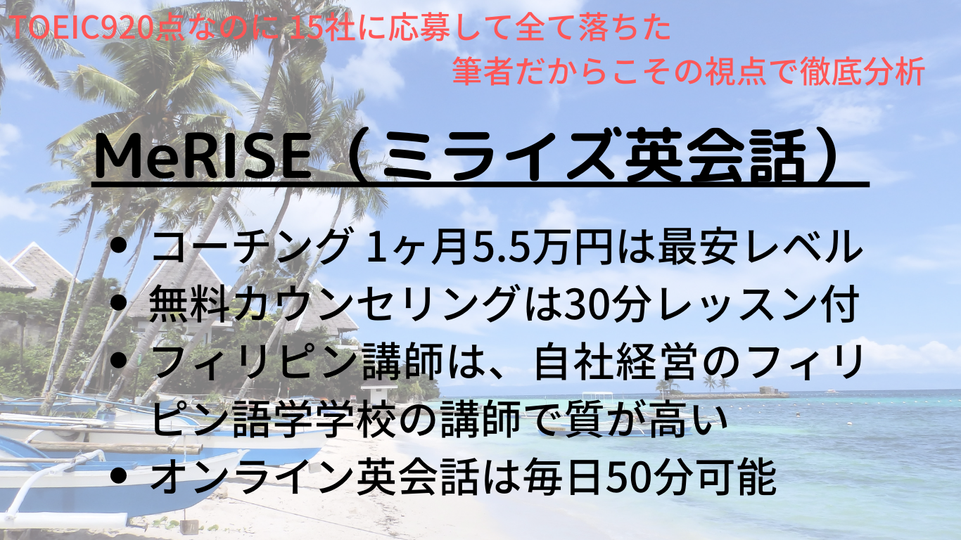 MeRISEは、フィリピン語学学校→日本での英会話スクール→オンライン英会話スクール・コーチングという経緯を辿っており、そもそもフィリピン語学学校を経営しようと思った動機からして、「質の高い英会話スクール」にこだわりがあるはずであり、そこは大きな差別化ポイントだと思います。