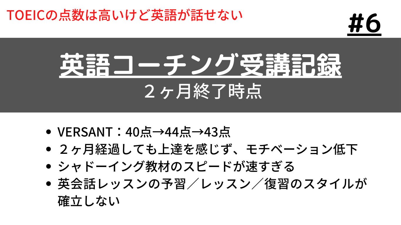 2ヶ月経過時点で受験したVersantは43点でした。英語コーチング受験前の40点から3点してか上がっておらず、1ヶ月経過時点での44点から1点下がり、とてもツラかったです。